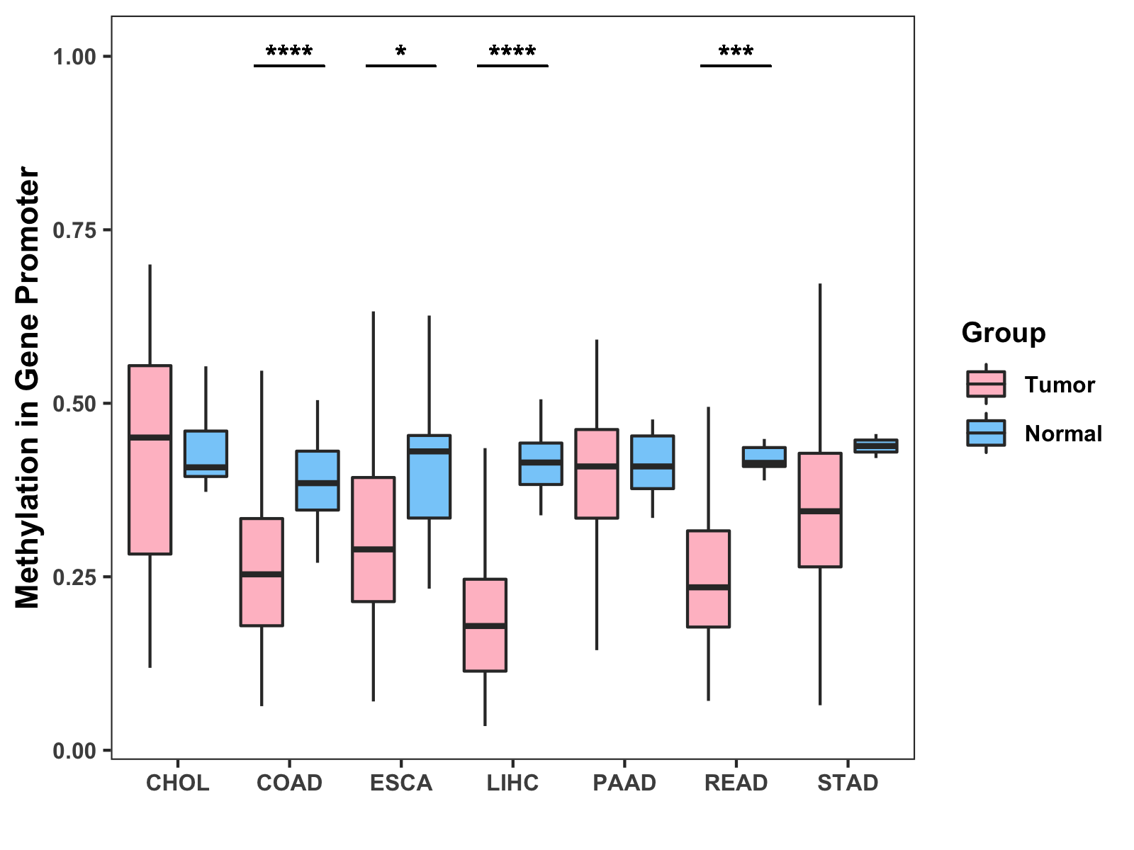 Boxplot of All Gastrointestinal Cancer ( * : 0.01-0.05 , ** : 0.005-0.01 , *** : 0.0001-0.005 , **** : < 0.0001 ) |