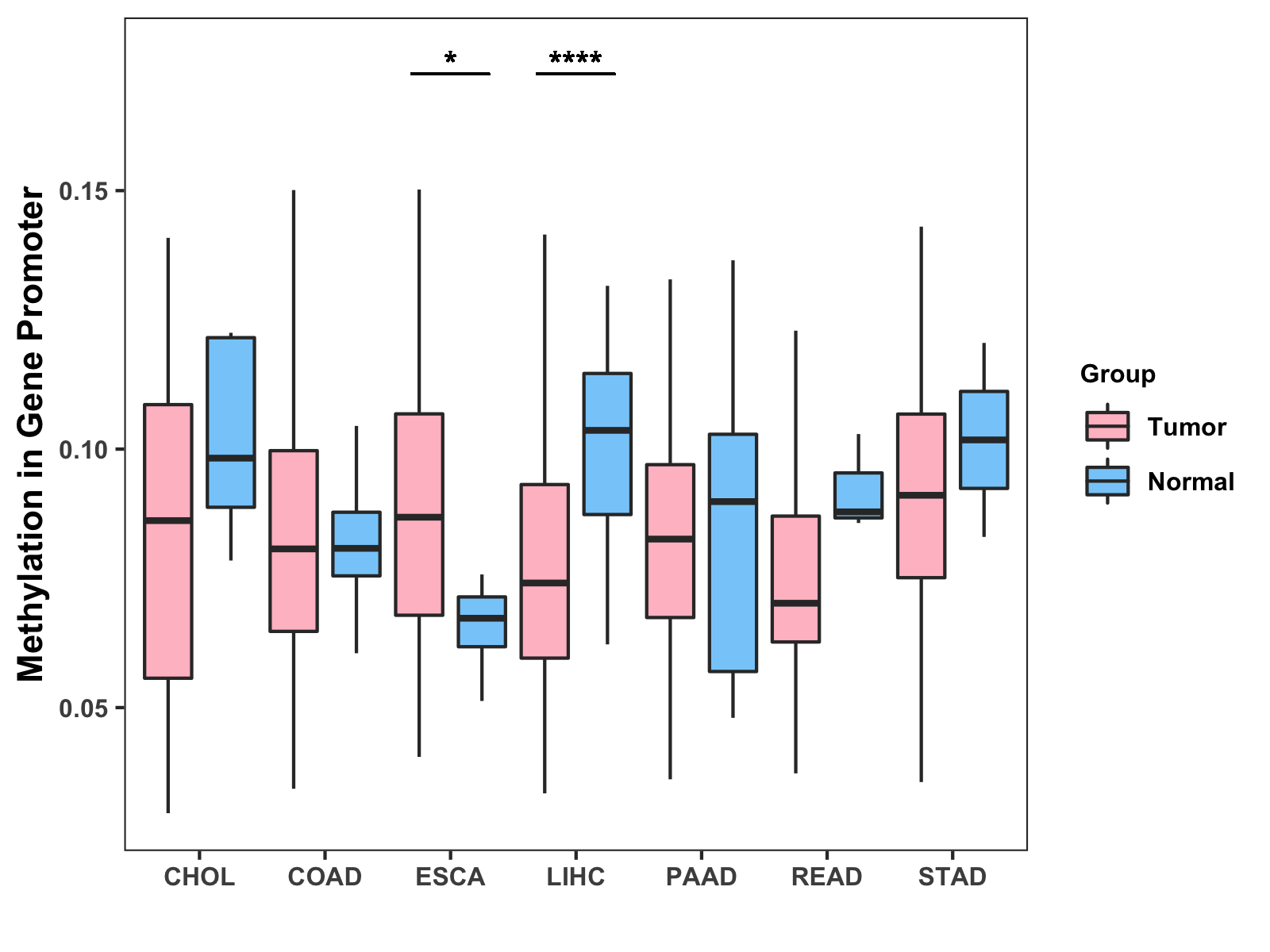 Boxplot of All Gastrointestinal Cancer ( * : 0.01-0.05 , ** : 0.005-0.01 , *** : 0.0001-0.005 , **** : < 0.0001 ) |