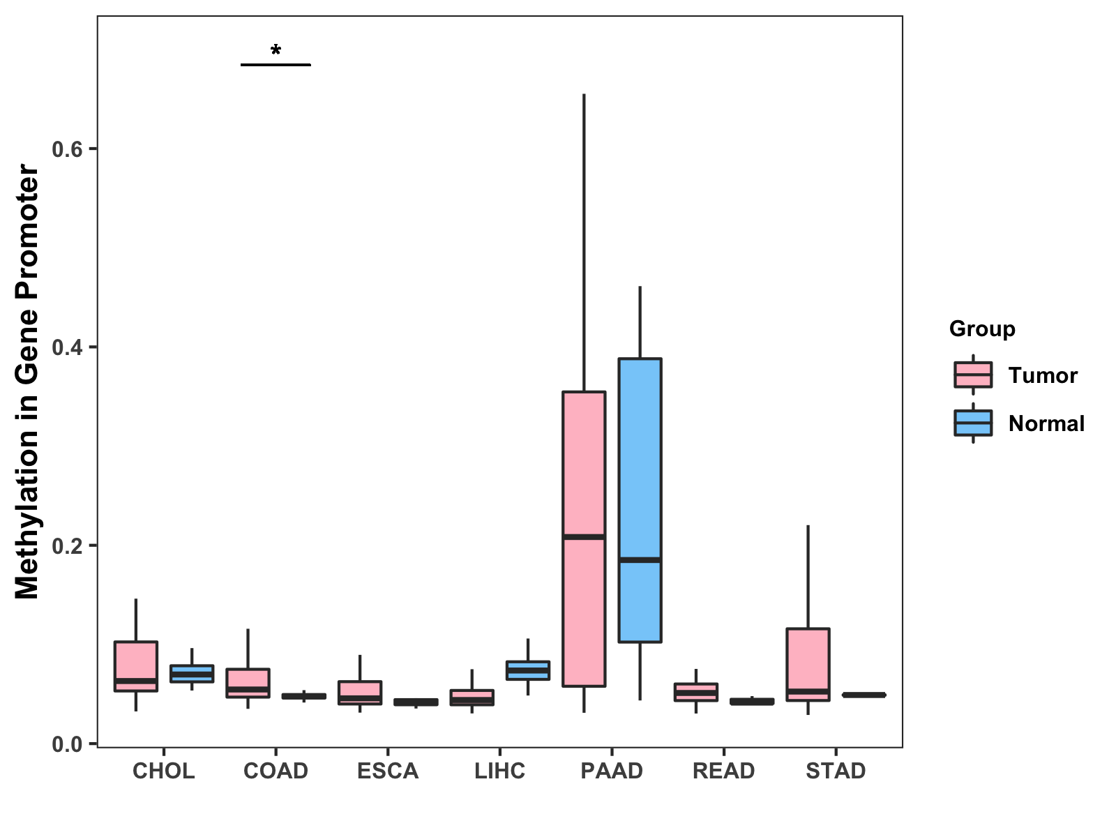 Boxplot of All Gastrointestinal Cancer ( * : 0.01-0.05 , ** : 0.005-0.01 , *** : 0.0001-0.005 , **** : < 0.0001 ) |