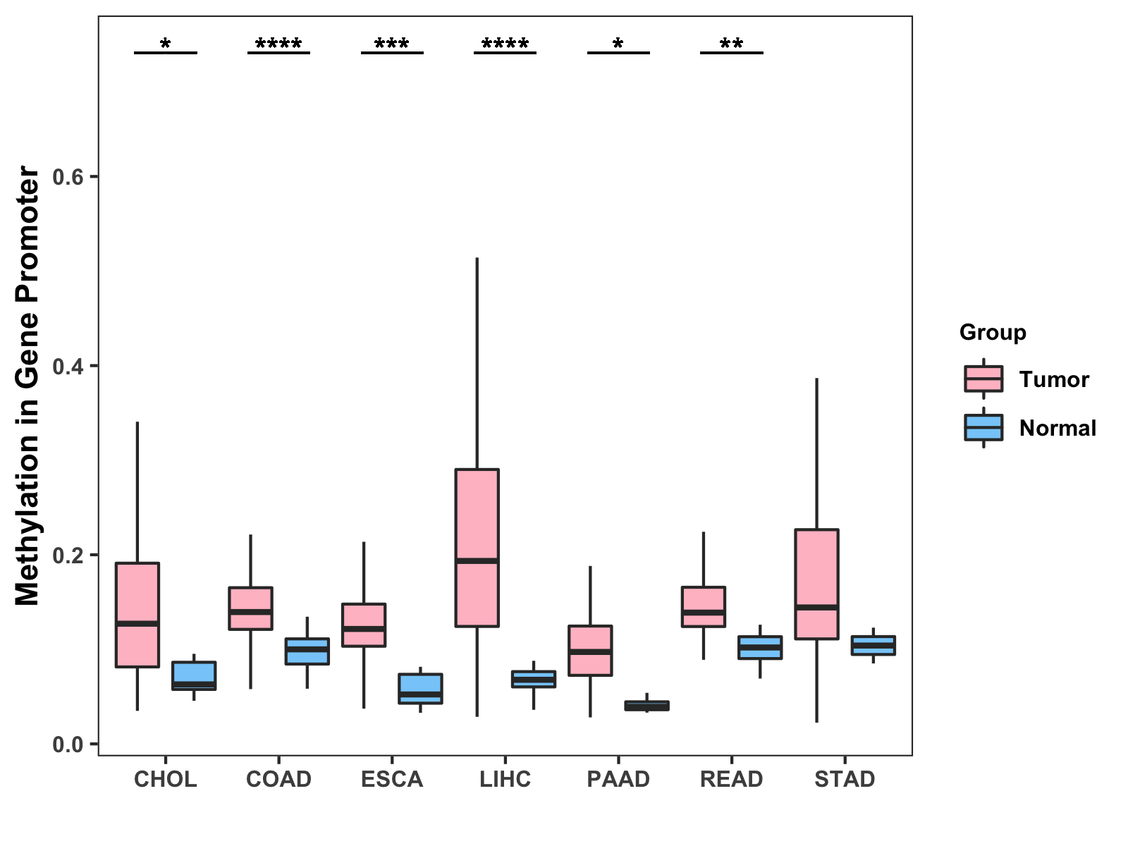 Boxplot of All Gastrointestinal Cancer ( * : 0.01-0.05 , ** : 0.005-0.01 , *** : 0.0001-0.005 , **** : < 0.0001 ) |