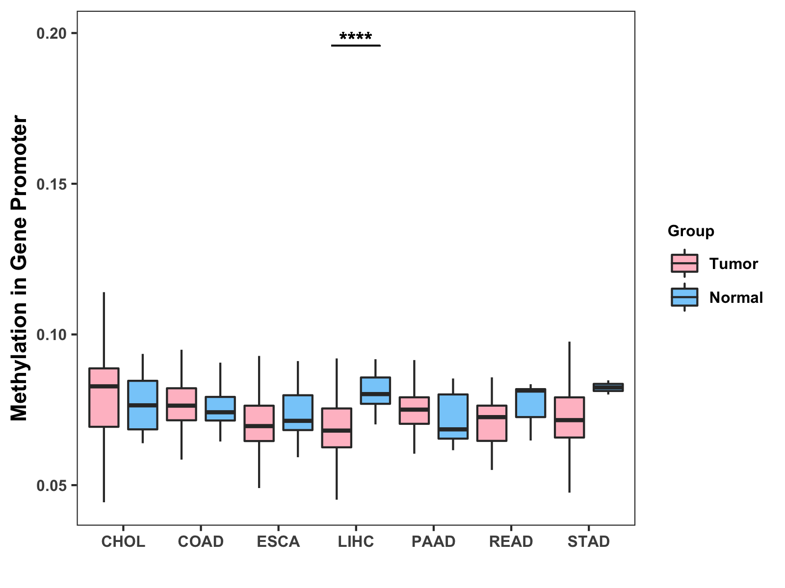 Boxplot of All Gastrointestinal Cancer ( * : 0.01-0.05 , ** : 0.005-0.01 , *** : 0.0001-0.005 , **** : < 0.0001 ) |