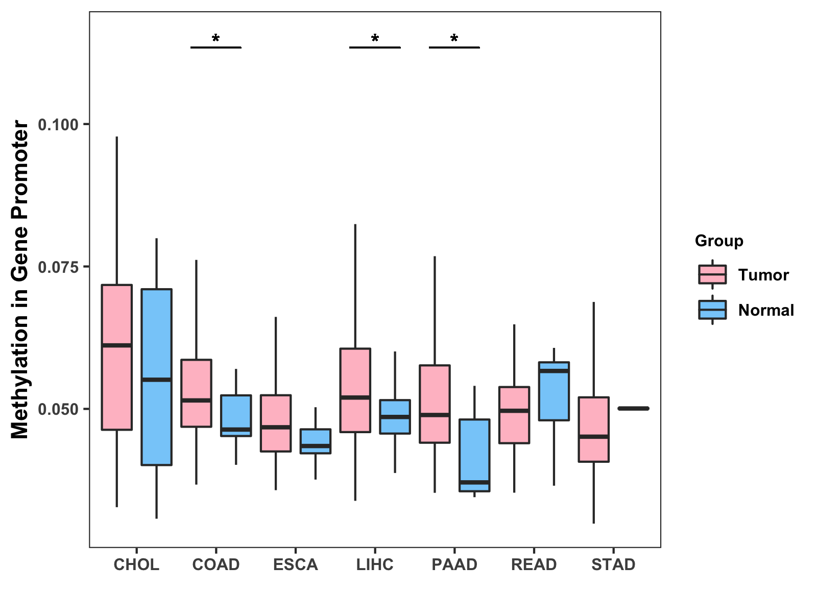 Boxplot of All Gastrointestinal Cancer ( * : 0.01-0.05 , ** : 0.005-0.01 , *** : 0.0001-0.005 , **** : < 0.0001 ) |