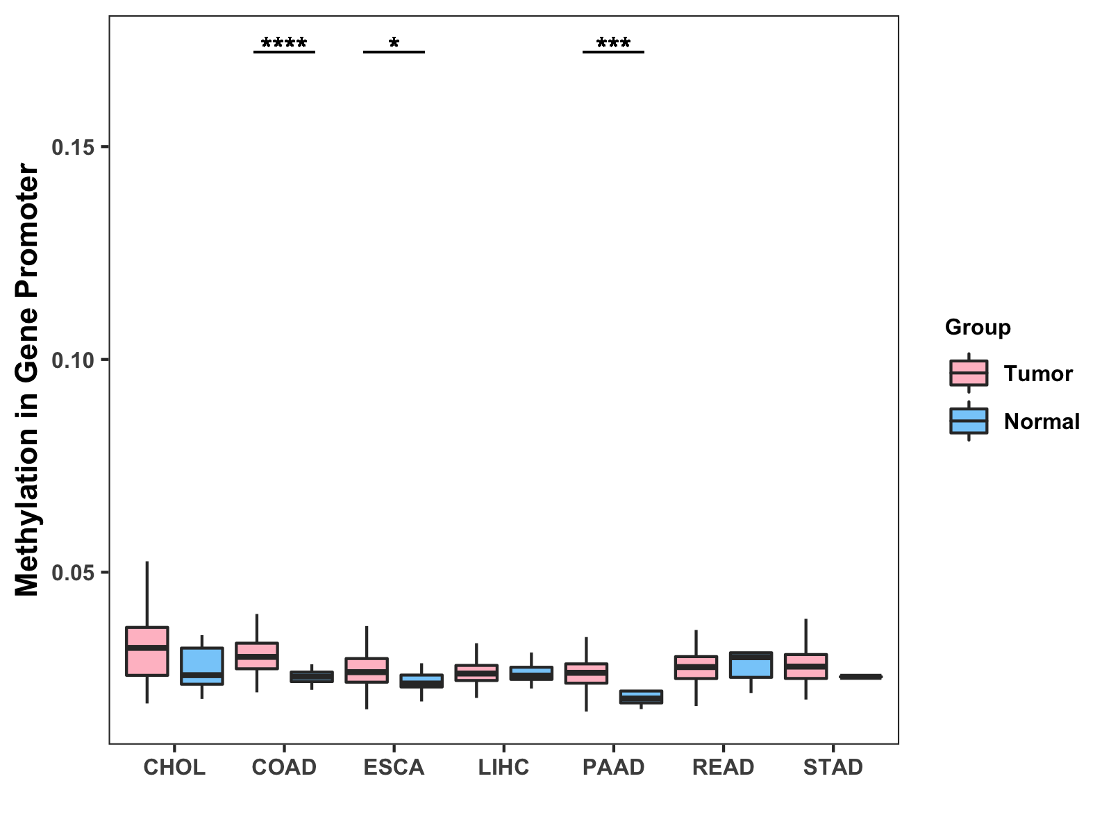 Boxplot of All Gastrointestinal Cancer ( * : 0.01-0.05 , ** : 0.005-0.01 , *** : 0.0001-0.005 , **** : < 0.0001 ) |