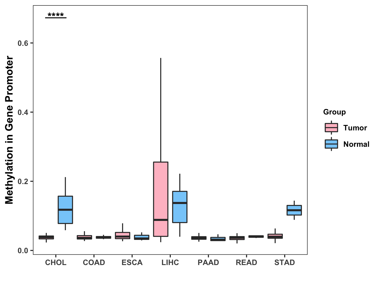 Boxplot of All Gastrointestinal Cancer ( * : 0.01-0.05 , ** : 0.005-0.01 , *** : 0.0001-0.005 , **** : < 0.0001 ) |