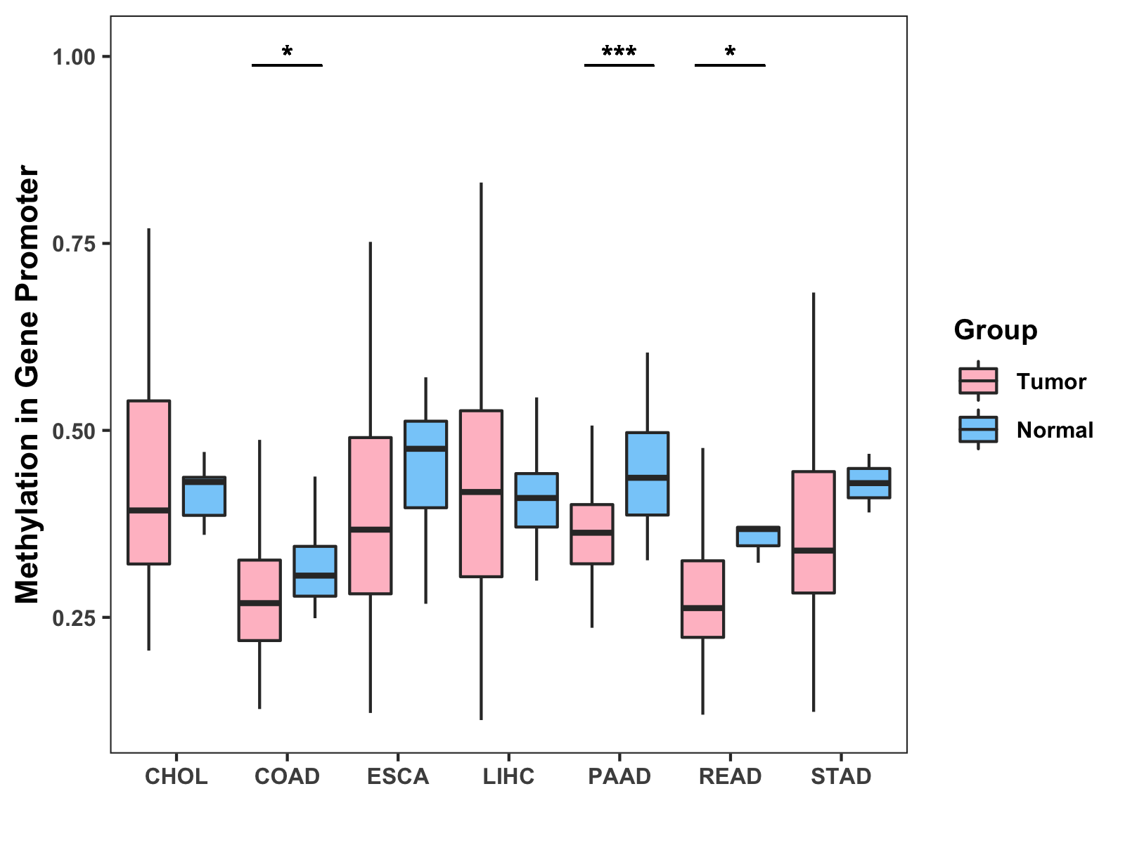Boxplot of All Gastrointestinal Cancer ( * : 0.01-0.05 , ** : 0.005-0.01 , *** : 0.0001-0.005 , **** : < 0.0001 ) |