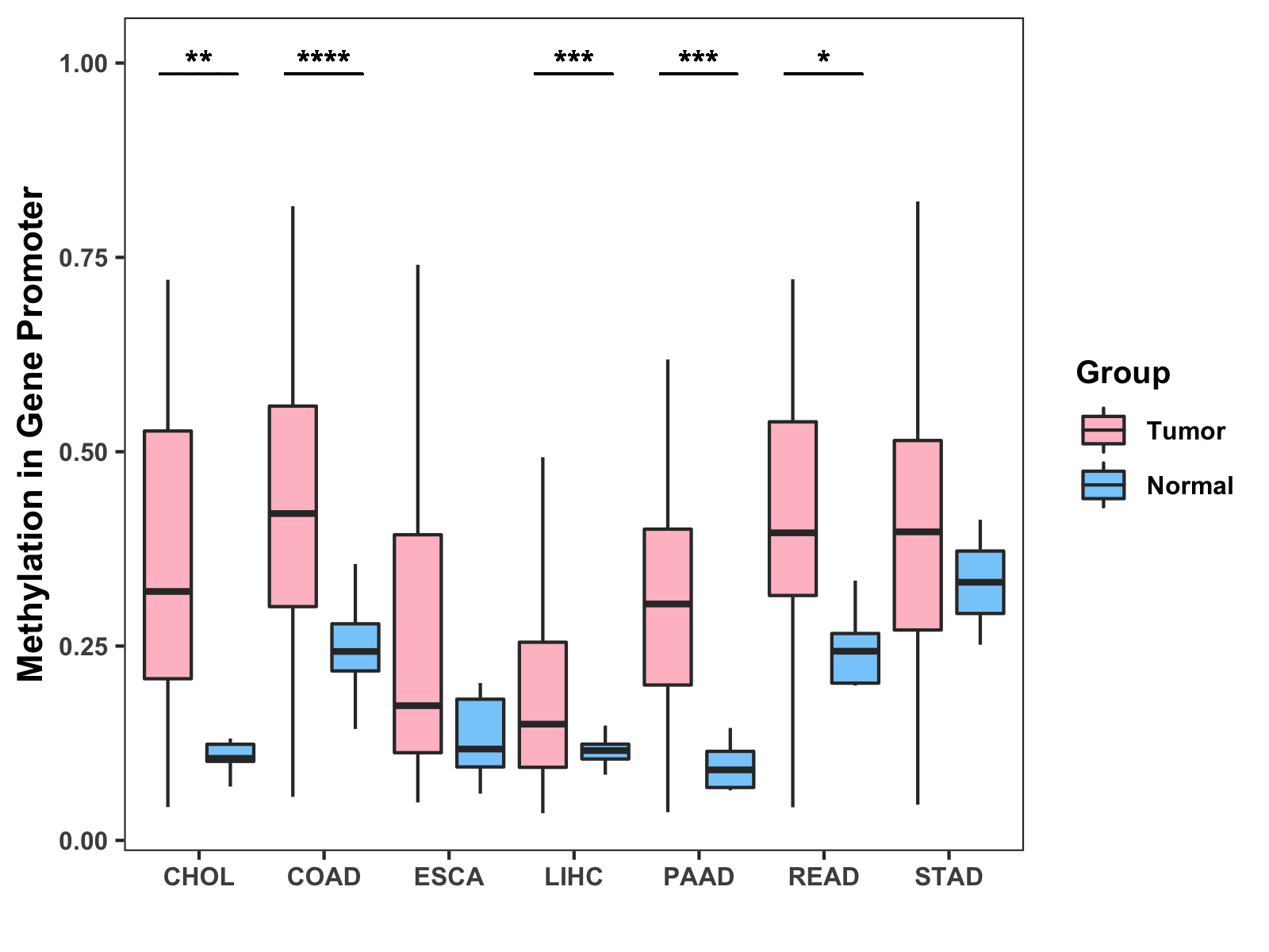 Boxplot of All Gastrointestinal Cancer ( * : 0.01-0.05 , ** : 0.005-0.01 , *** : 0.0001-0.005 , **** : < 0.0001 ) |