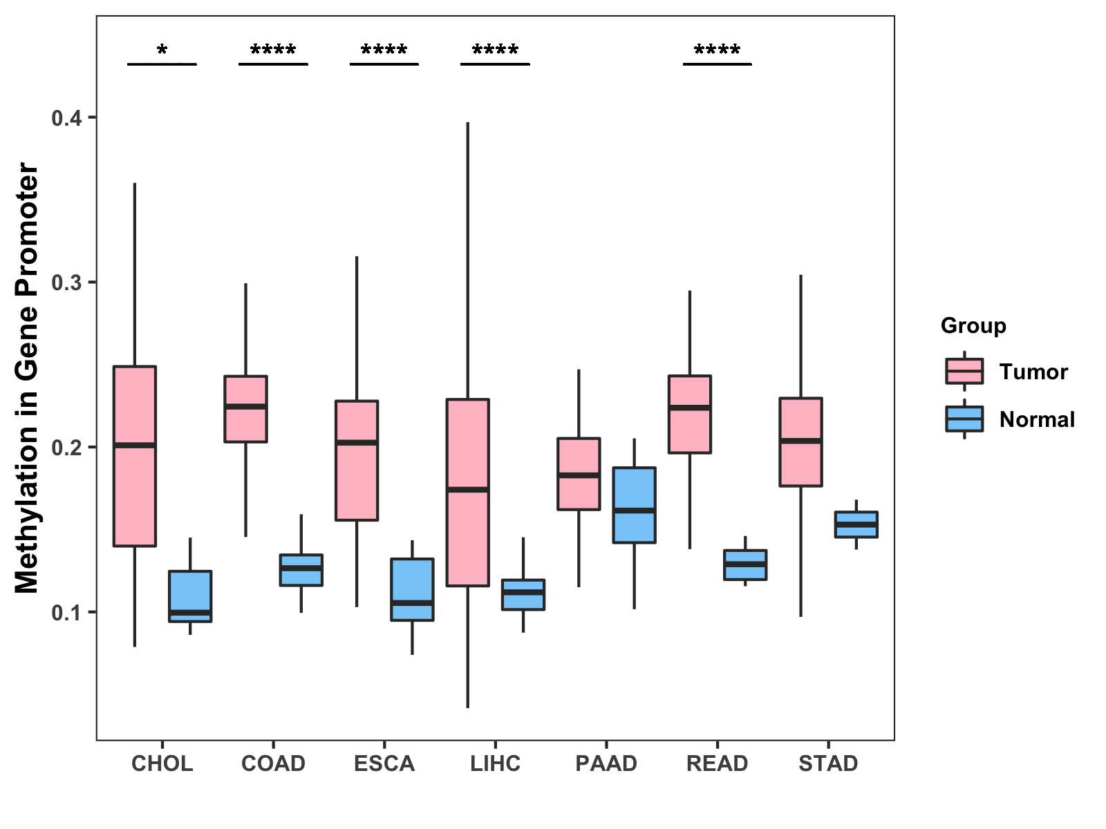 Boxplot of All Gastrointestinal Cancer ( * : 0.01-0.05 , ** : 0.005-0.01 , *** : 0.0001-0.005 , **** : < 0.0001 ) |