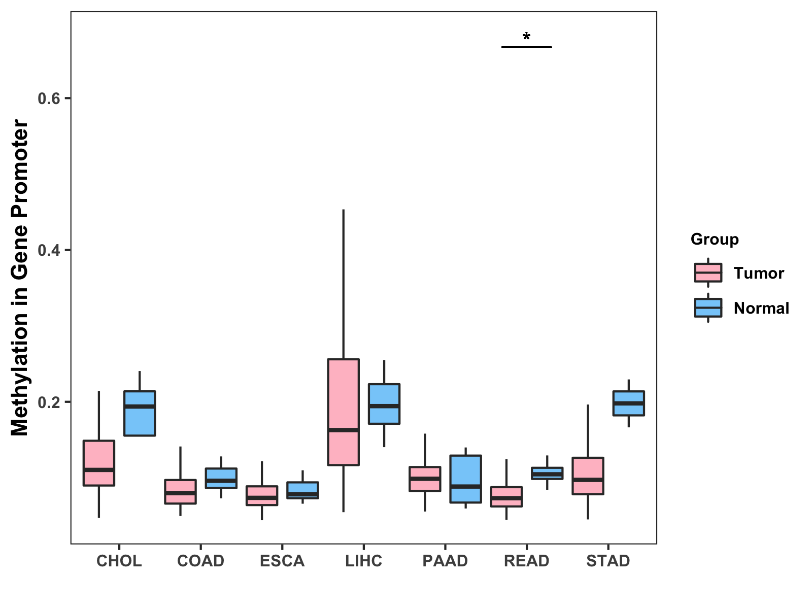 Boxplot of All Gastrointestinal Cancer ( * : 0.01-0.05 , ** : 0.005-0.01 , *** : 0.0001-0.005 , **** : < 0.0001 ) |