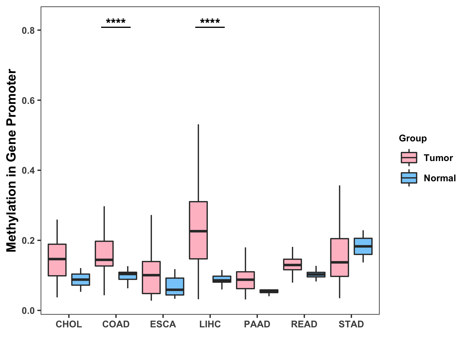 Boxplot of All Gastrointestinal Cancer ( * : 0.01-0.05 , ** : 0.005-0.01 , *** : 0.0001-0.005 , **** : < 0.0001 ) |