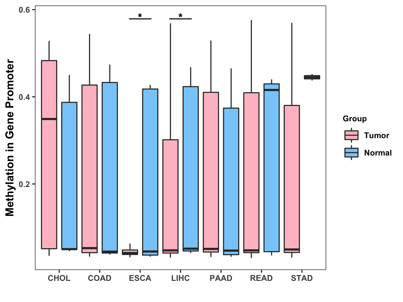 Boxplot of All Gastrointestinal Cancer ( * : 0.01-0.05 , ** : 0.005-0.01 , *** : 0.0001-0.005 , **** : < 0.0001 ) |