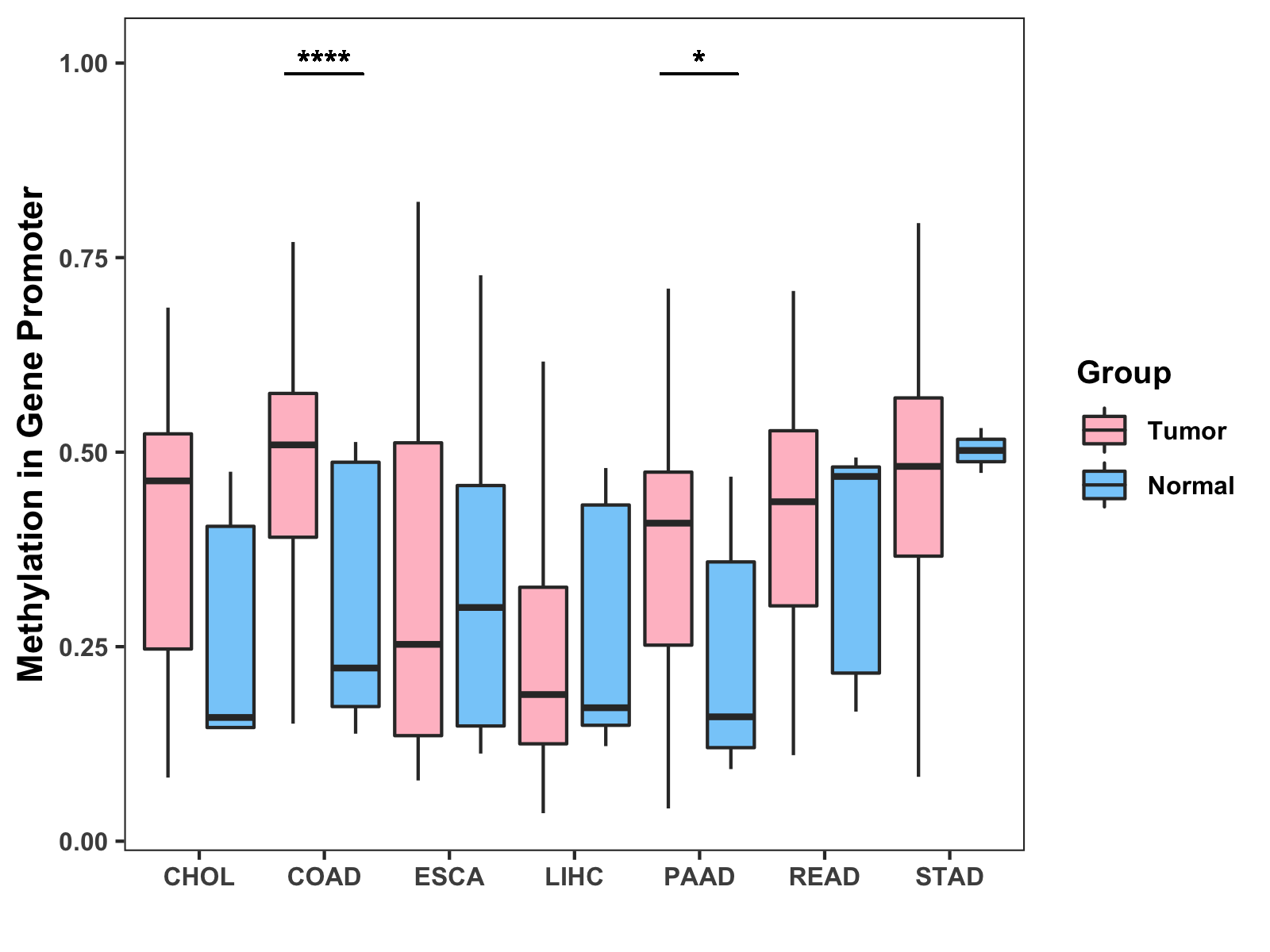 Boxplot of All Gastrointestinal Cancer ( * : 0.01-0.05 , ** : 0.005-0.01 , *** : 0.0001-0.005 , **** : < 0.0001 ) |