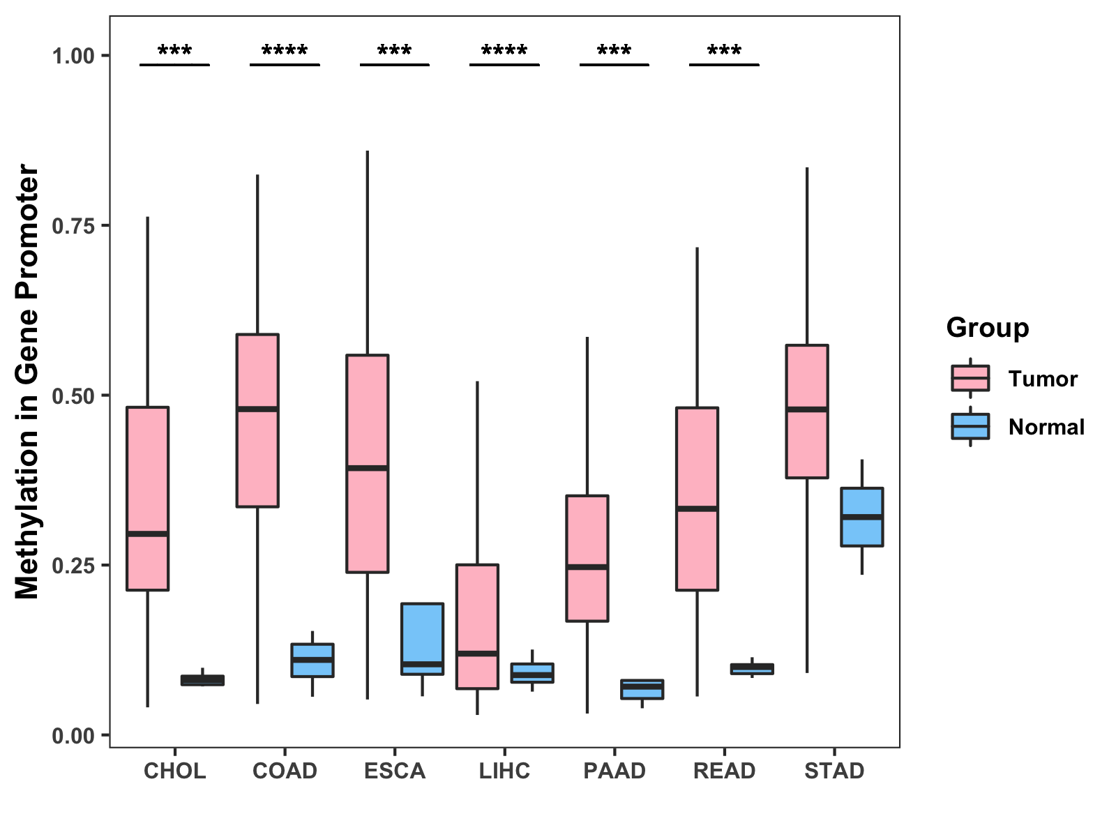 Boxplot of All Gastrointestinal Cancer ( * : 0.01-0.05 , ** : 0.005-0.01 , *** : 0.0001-0.005 , **** : < 0.0001 ) |