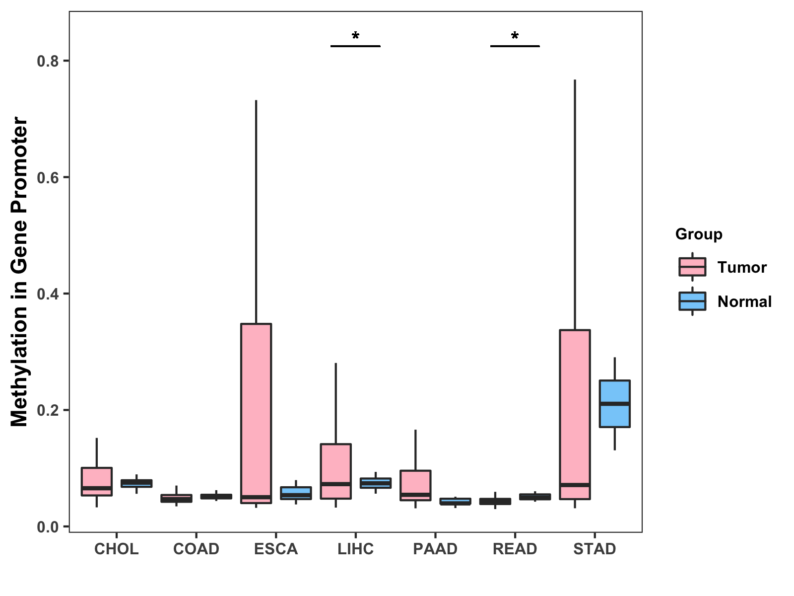 Boxplot of All Gastrointestinal Cancer ( * : 0.01-0.05 , ** : 0.005-0.01 , *** : 0.0001-0.005 , **** : < 0.0001 ) |