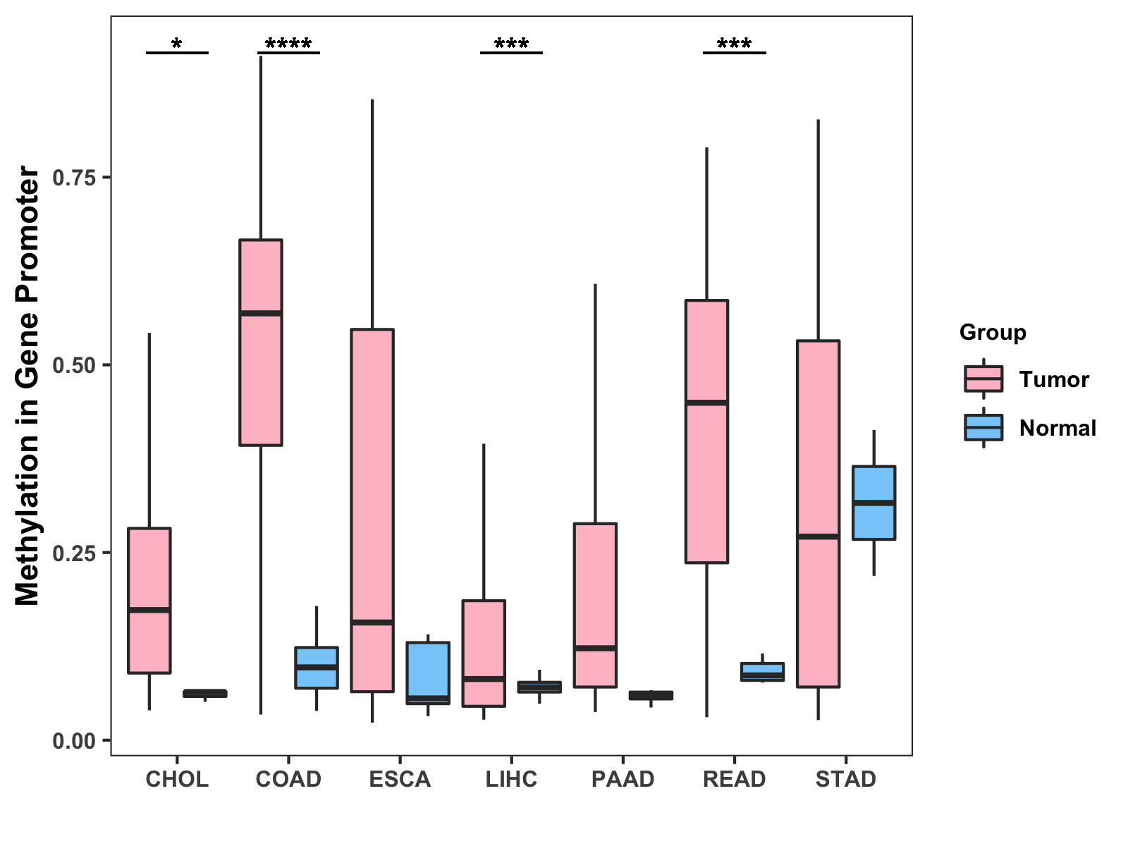 Boxplot of All Gastrointestinal Cancer ( * : 0.01-0.05 , ** : 0.005-0.01 , *** : 0.0001-0.005 , **** : < 0.0001 ) |