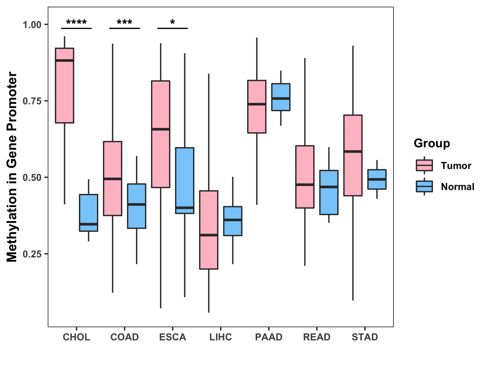 Boxplot of All Gastrointestinal Cancer ( * : 0.01-0.05 , ** : 0.005-0.01 , *** : 0.0001-0.005 , **** : < 0.0001 ) |
