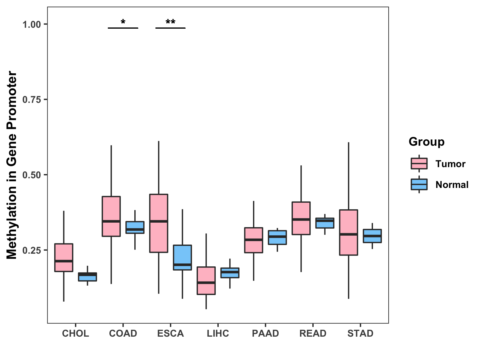 Boxplot of All Gastrointestinal Cancer ( * : 0.01-0.05 , ** : 0.005-0.01 , *** : 0.0001-0.005 , **** : < 0.0001 ) |