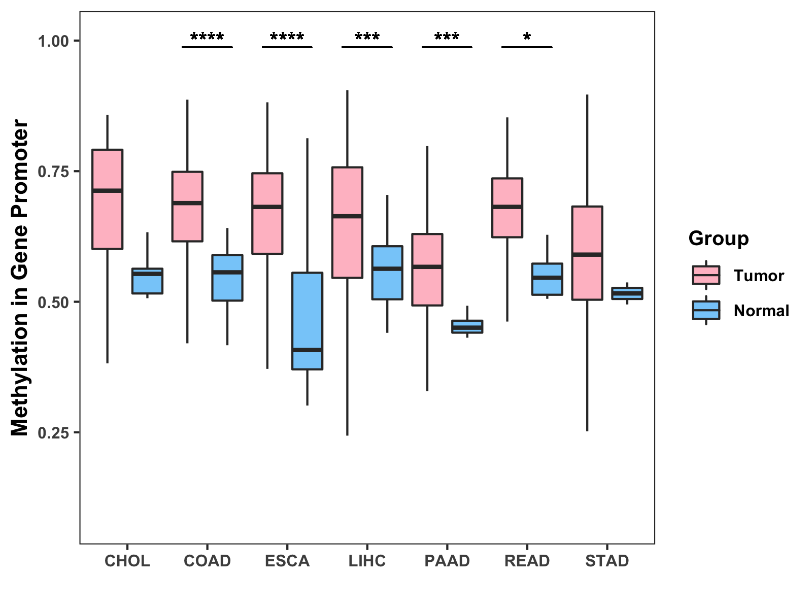 Boxplot of All Gastrointestinal Cancer ( * : 0.01-0.05 , ** : 0.005-0.01 , *** : 0.0001-0.005 , **** : < 0.0001 ) |
