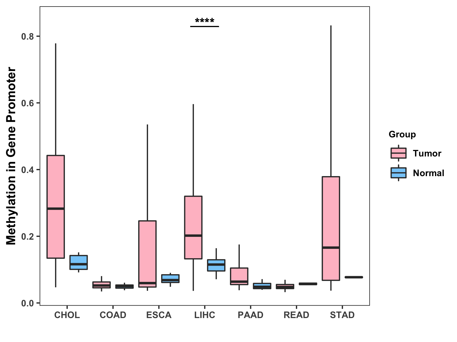Boxplot of All Gastrointestinal Cancer ( * : 0.01-0.05 , ** : 0.005-0.01 , *** : 0.0001-0.005 , **** : < 0.0001 ) |