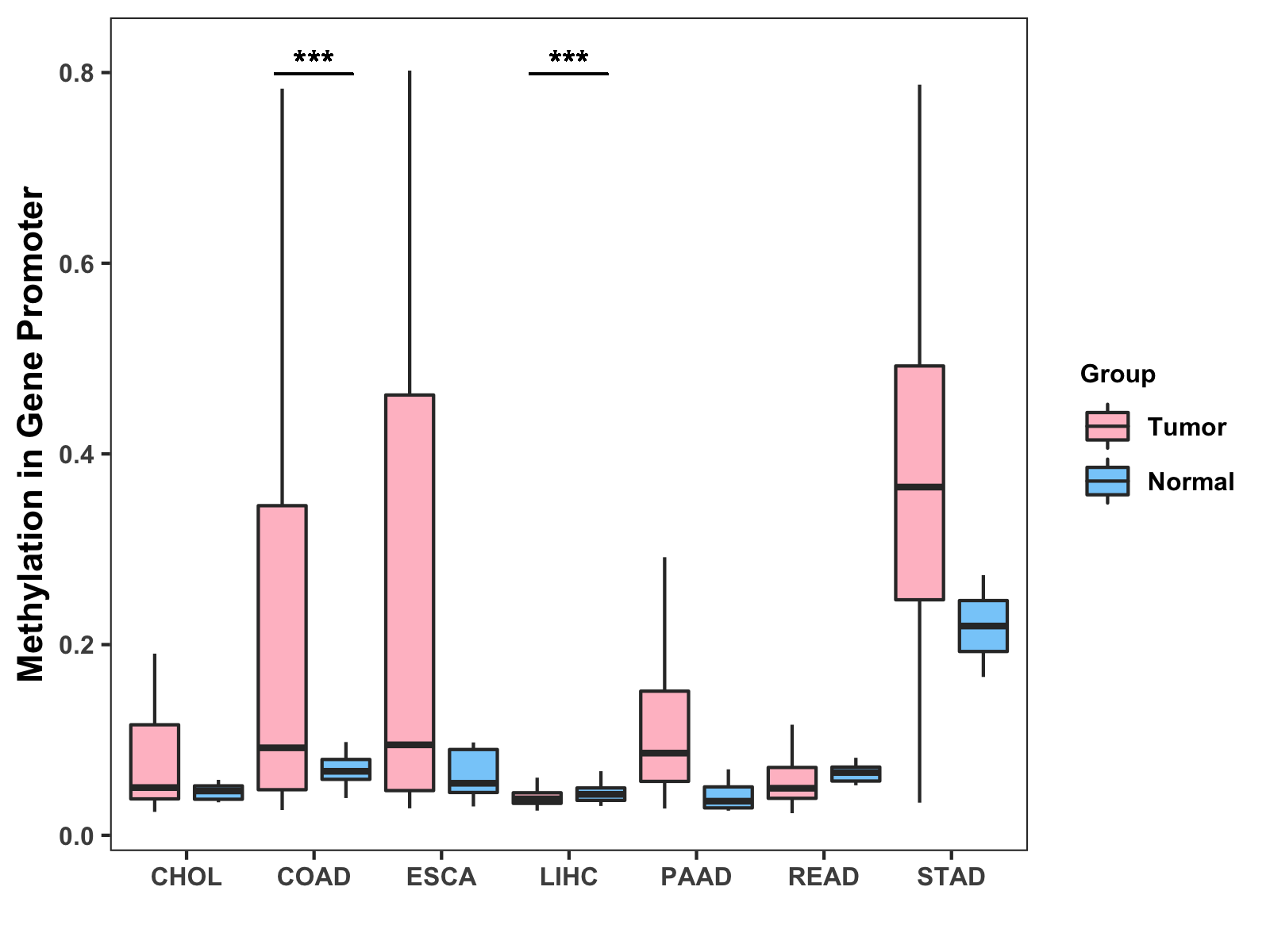Boxplot of All Gastrointestinal Cancer ( * : 0.01-0.05 , ** : 0.005-0.01 , *** : 0.0001-0.005 , **** : < 0.0001 ) |