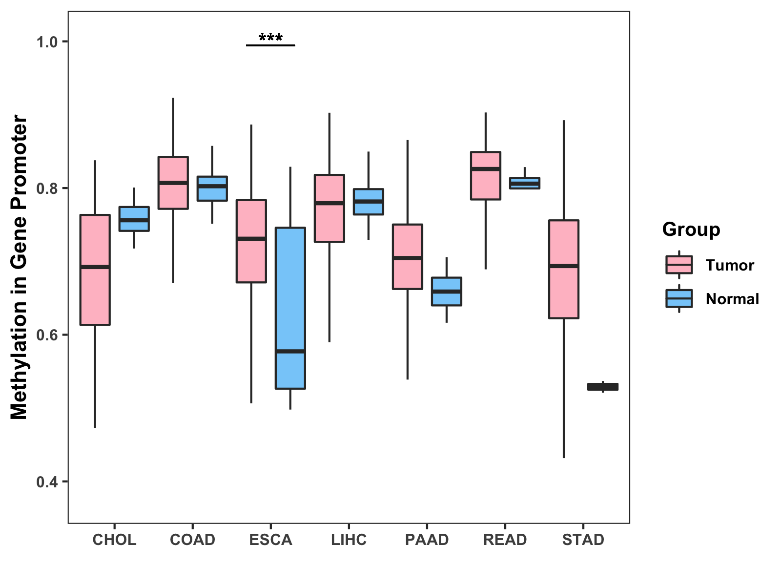 Boxplot of All Gastrointestinal Cancer ( * : 0.01-0.05 , ** : 0.005-0.01 , *** : 0.0001-0.005 , **** : < 0.0001 ) |