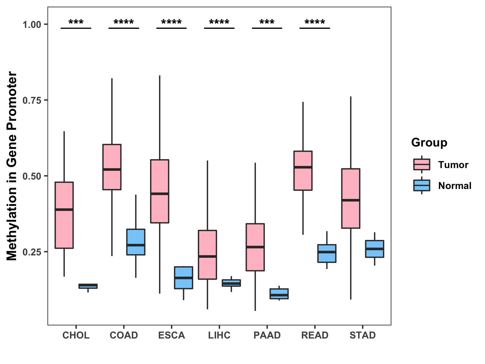 Boxplot of All Gastrointestinal Cancer ( * : 0.01-0.05 , ** : 0.005-0.01 , *** : 0.0001-0.005 , **** : < 0.0001 ) |