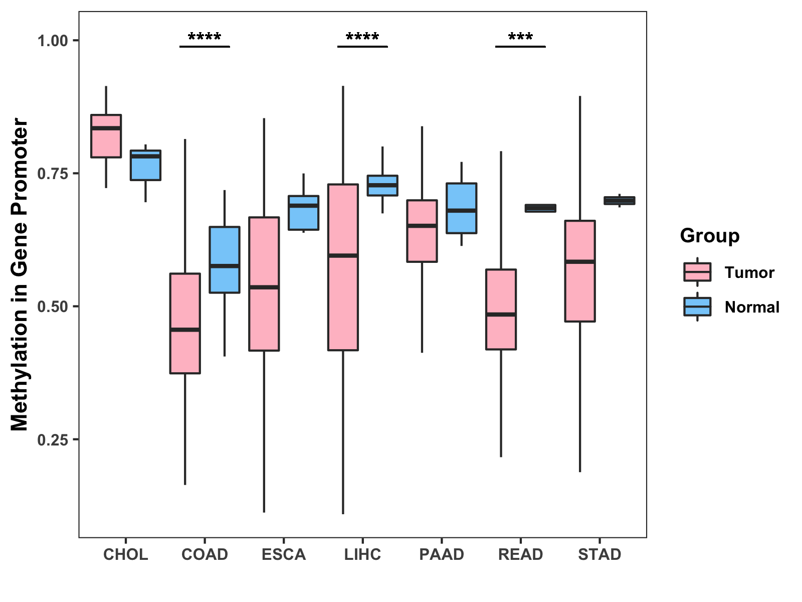 Boxplot of All Gastrointestinal Cancer ( * : 0.01-0.05 , ** : 0.005-0.01 , *** : 0.0001-0.005 , **** : < 0.0001 ) |