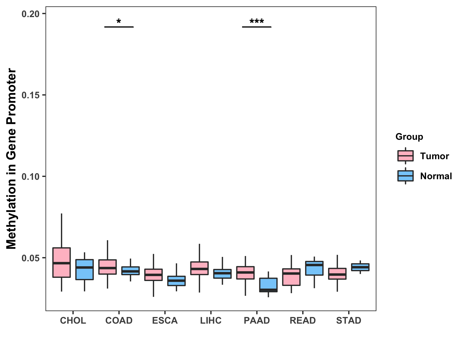 Boxplot of All Gastrointestinal Cancer ( * : 0.01-0.05 , ** : 0.005-0.01 , *** : 0.0001-0.005 , **** : < 0.0001 ) |