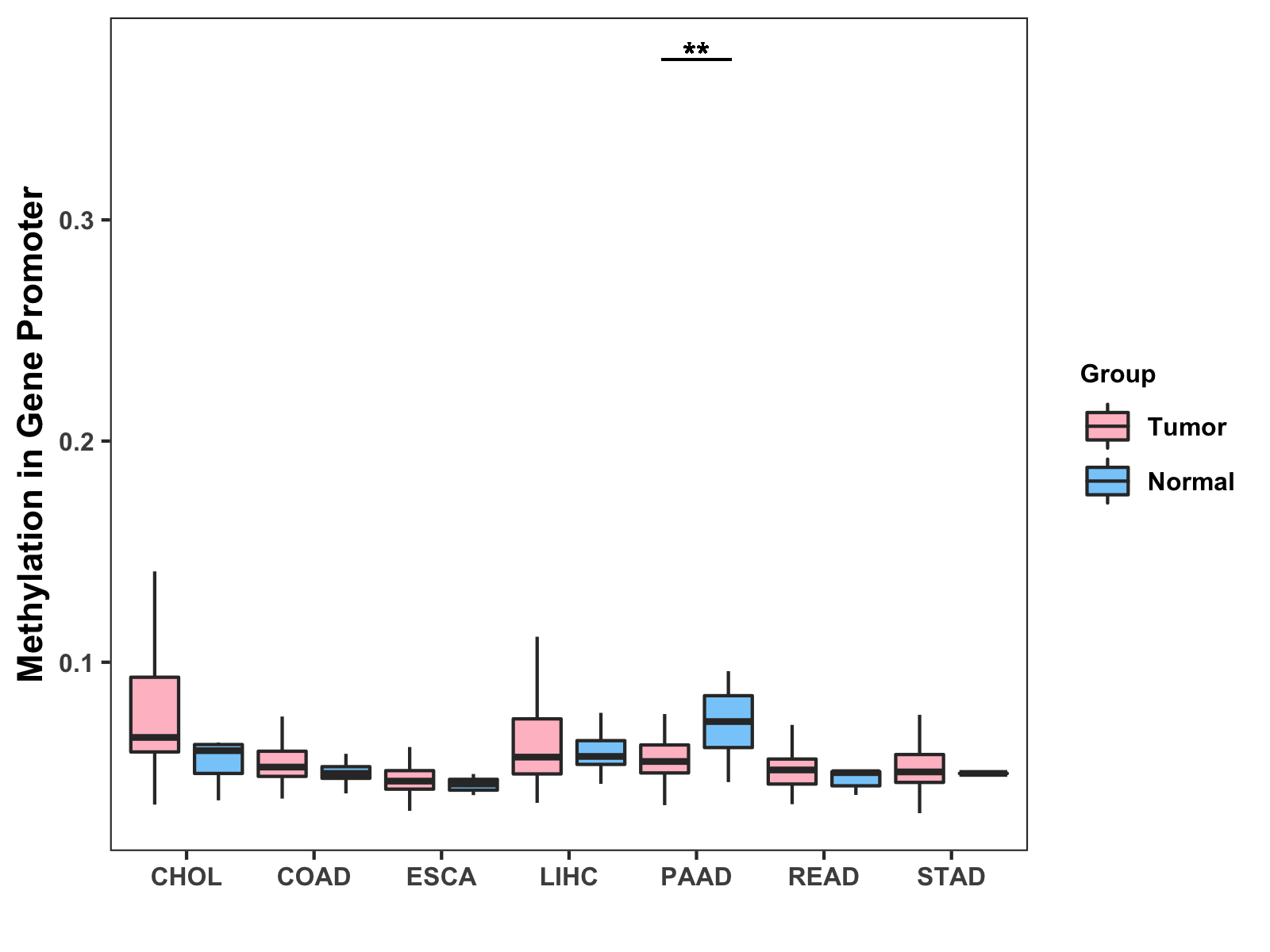 Boxplot of All Gastrointestinal Cancer ( * : 0.01-0.05 , ** : 0.005-0.01 , *** : 0.0001-0.005 , **** : < 0.0001 ) |