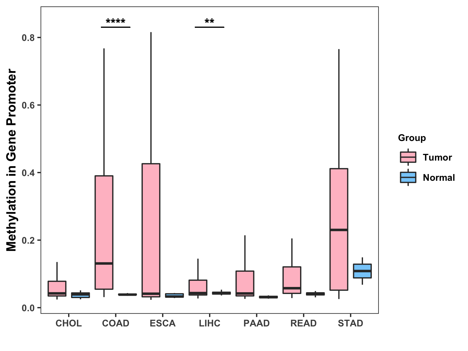 Boxplot of All Gastrointestinal Cancer ( * : 0.01-0.05 , ** : 0.005-0.01 , *** : 0.0001-0.005 , **** : < 0.0001 ) |