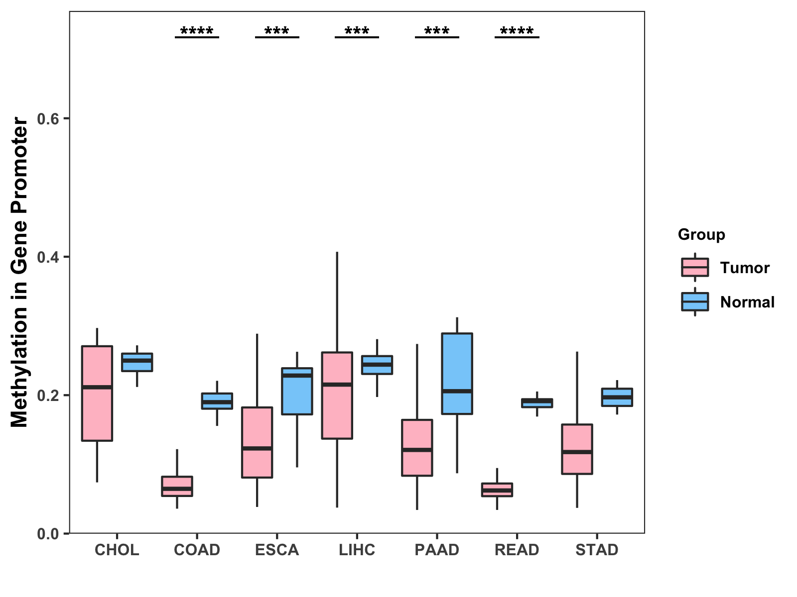 Boxplot of All Gastrointestinal Cancer ( * : 0.01-0.05 , ** : 0.005-0.01 , *** : 0.0001-0.005 , **** : < 0.0001 ) |