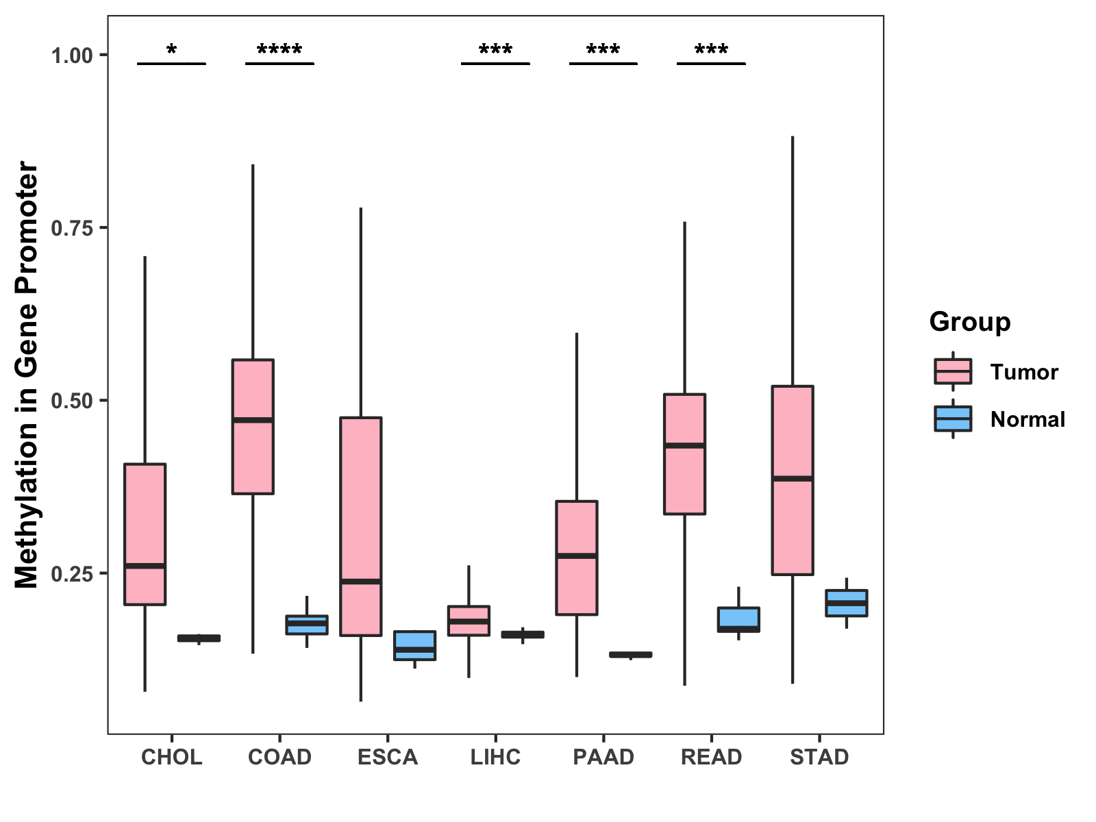 Boxplot of All Gastrointestinal Cancer ( * : 0.01-0.05 , ** : 0.005-0.01 , *** : 0.0001-0.005 , **** : < 0.0001 ) |