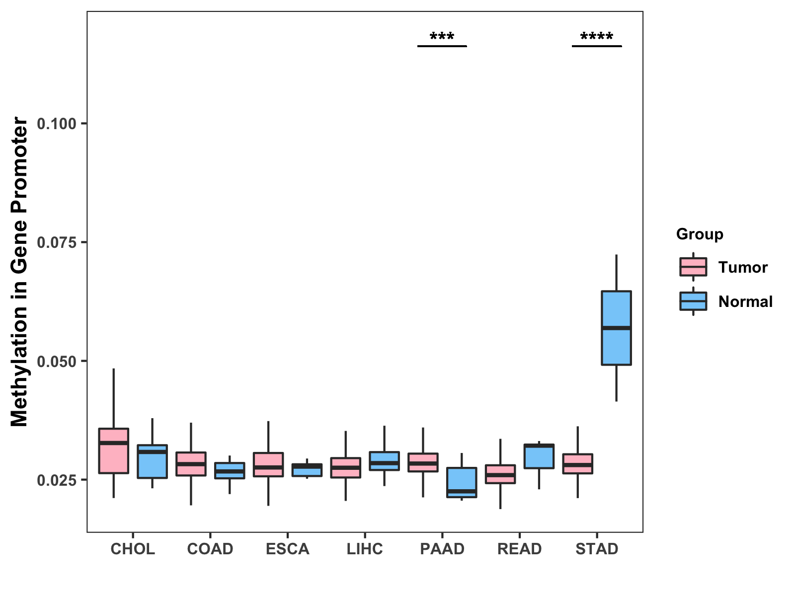 Boxplot of All Gastrointestinal Cancer ( * : 0.01-0.05 , ** : 0.005-0.01 , *** : 0.0001-0.005 , **** : < 0.0001 ) |