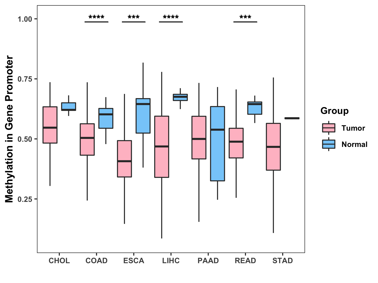 Boxplot of All Gastrointestinal Cancer ( * : 0.01-0.05 , ** : 0.005-0.01 , *** : 0.0001-0.005 , **** : < 0.0001 ) |