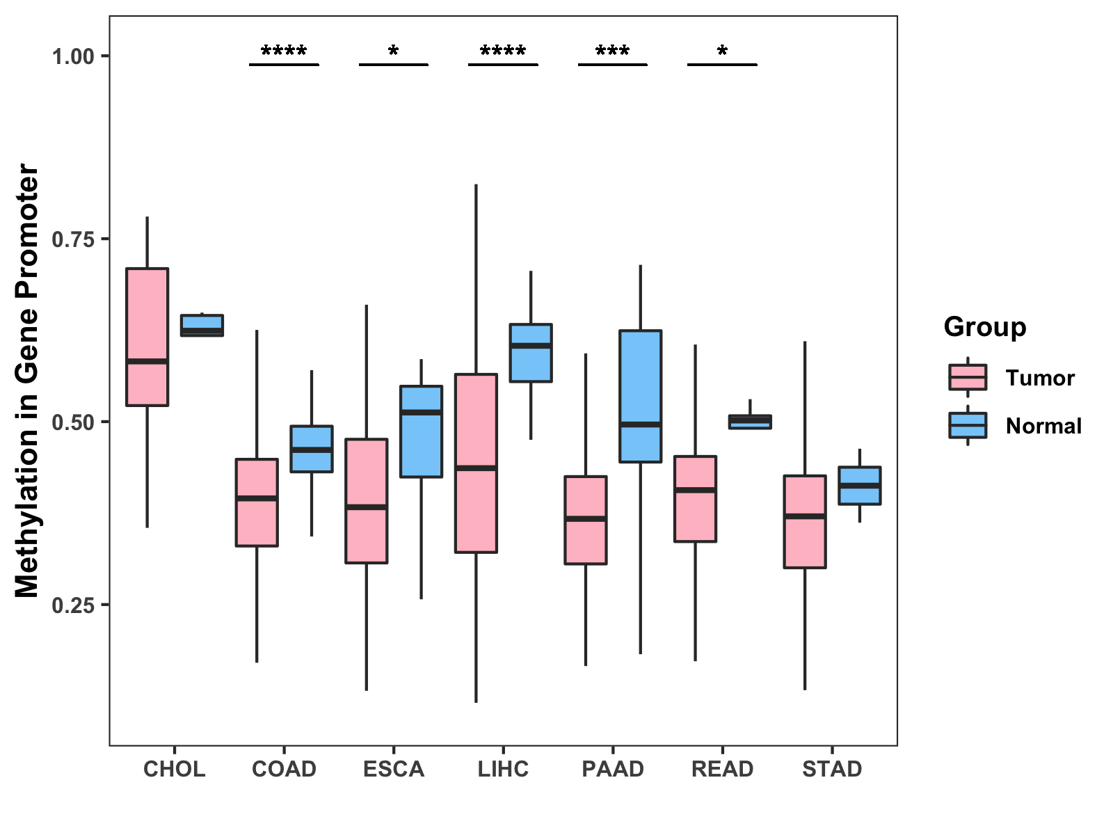 Boxplot of All Gastrointestinal Cancer ( * : 0.01-0.05 , ** : 0.005-0.01 , *** : 0.0001-0.005 , **** : < 0.0001 ) |
