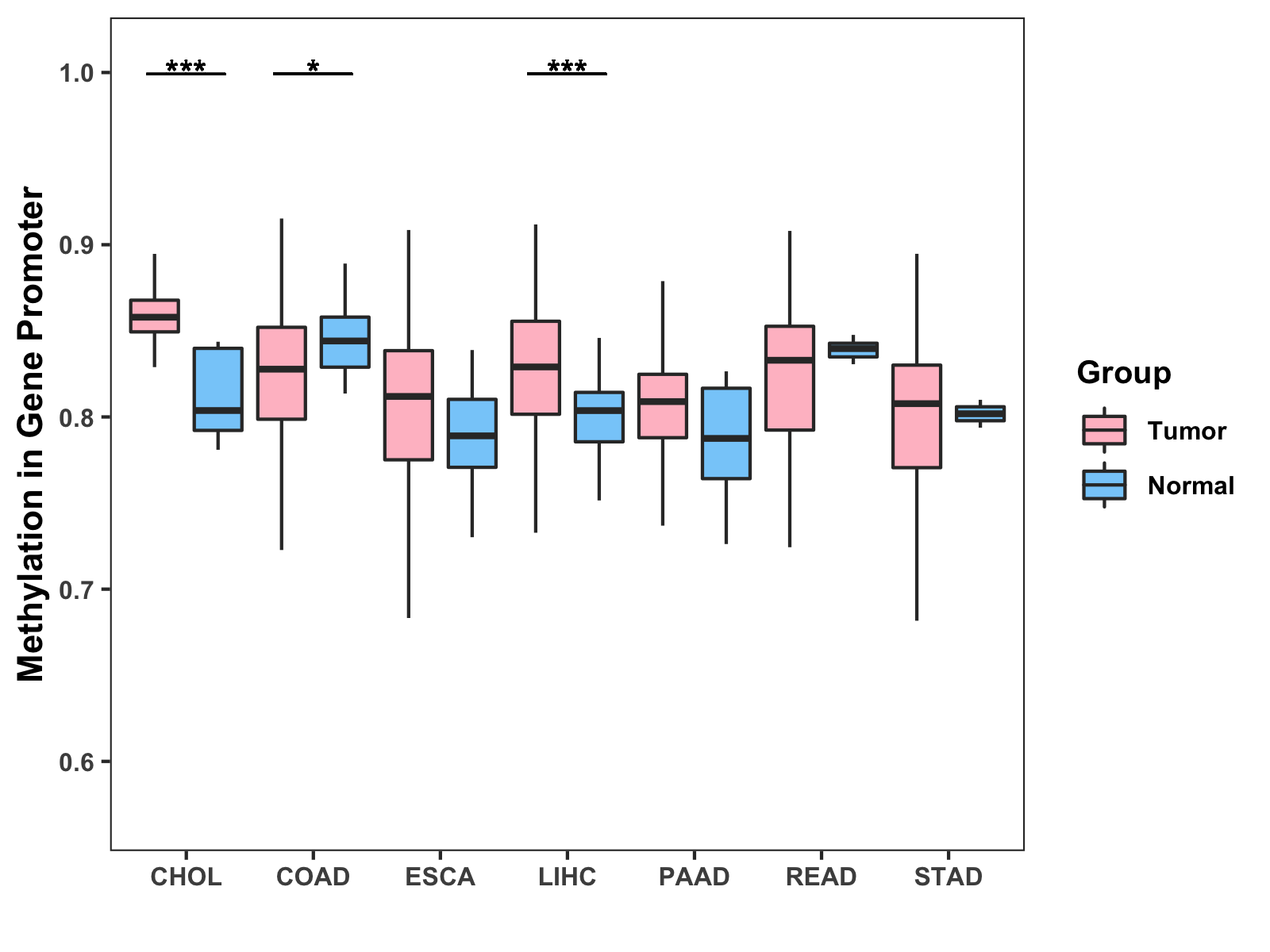 Boxplot of All Gastrointestinal Cancer ( * : 0.01-0.05 , ** : 0.005-0.01 , *** : 0.0001-0.005 , **** : < 0.0001 ) |