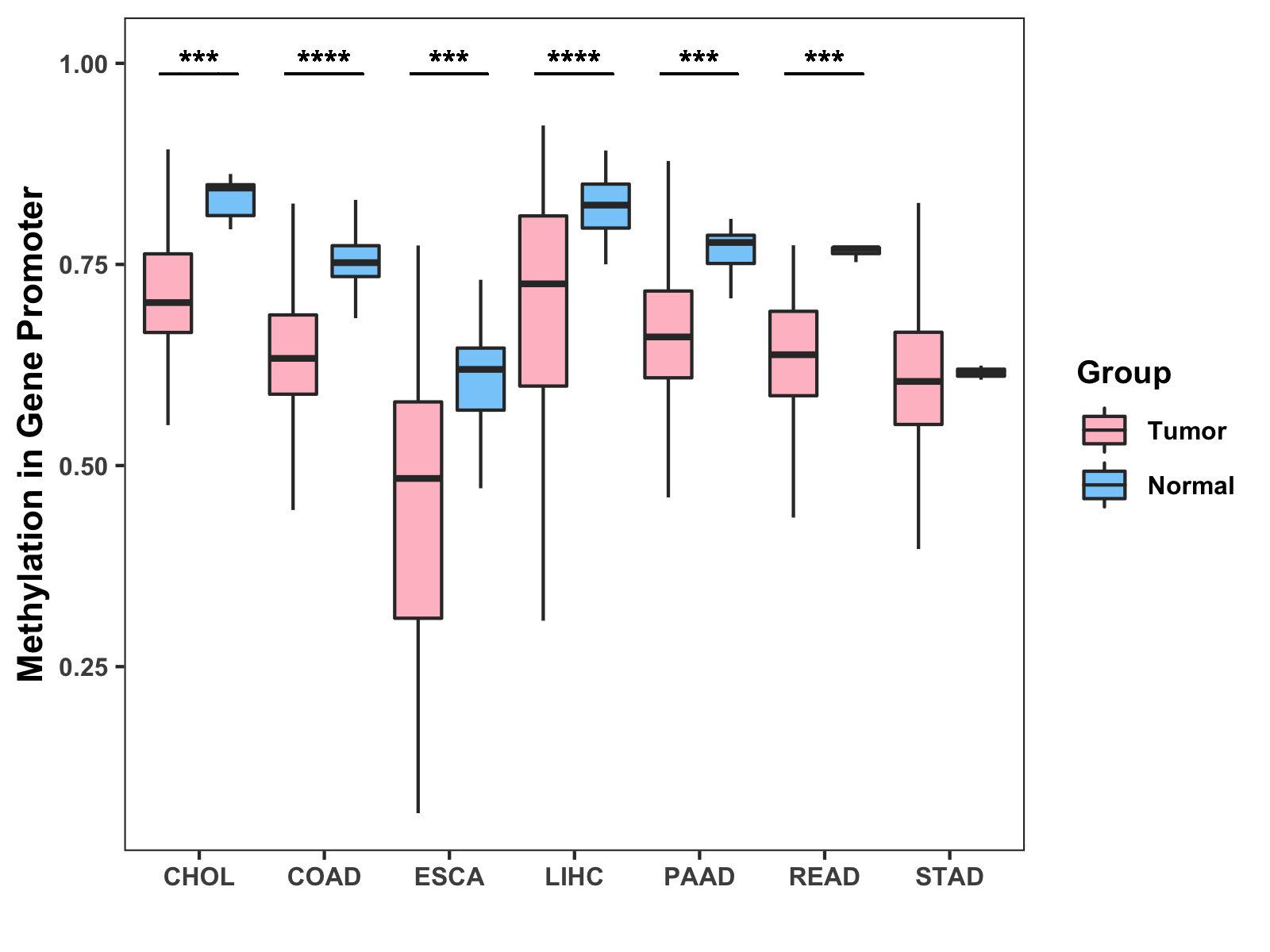 Boxplot of All Gastrointestinal Cancer ( * : 0.01-0.05 , ** : 0.005-0.01 , *** : 0.0001-0.005 , **** : < 0.0001 ) |