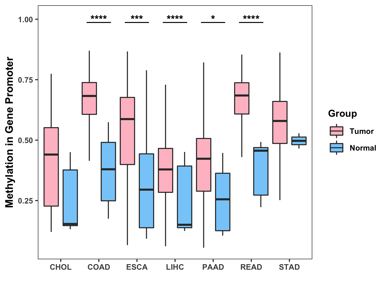 Boxplot of All Gastrointestinal Cancer ( * : 0.01-0.05 , ** : 0.005-0.01 , *** : 0.0001-0.005 , **** : < 0.0001 ) |