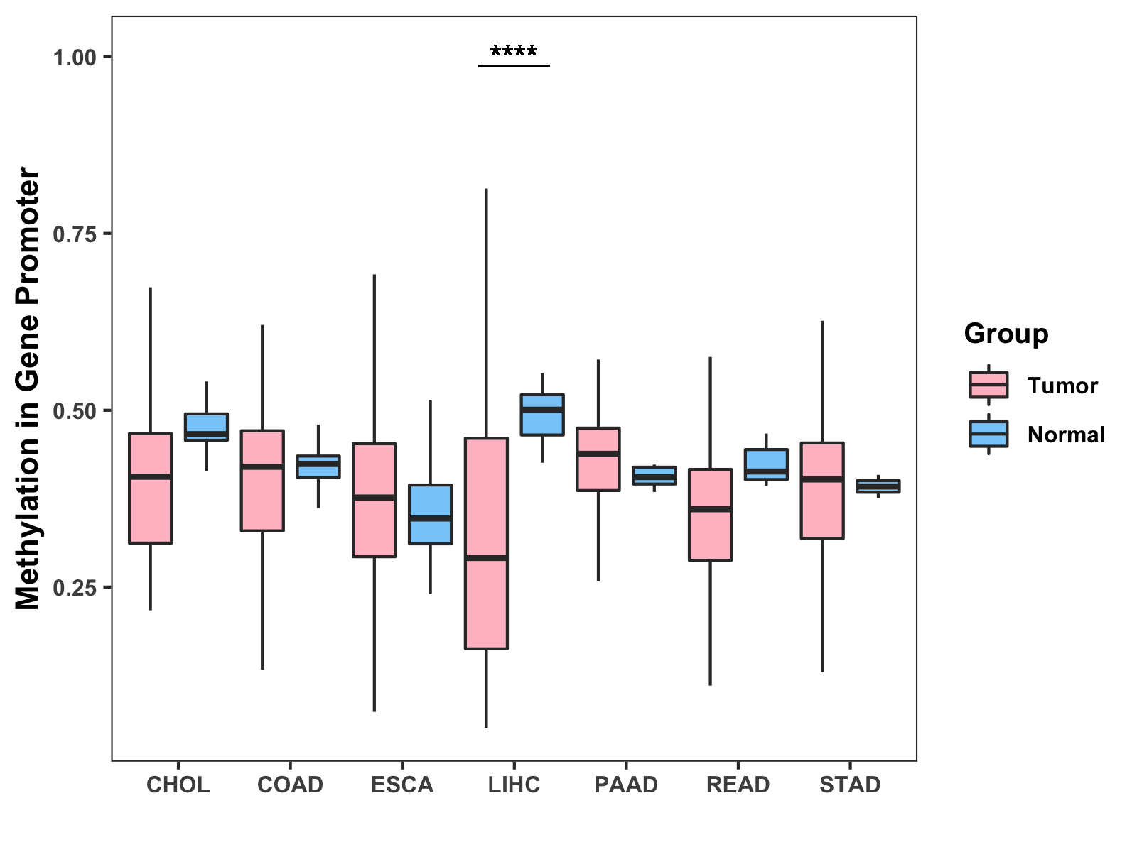 Boxplot of All Gastrointestinal Cancer ( * : 0.01-0.05 , ** : 0.005-0.01 , *** : 0.0001-0.005 , **** : < 0.0001 ) |