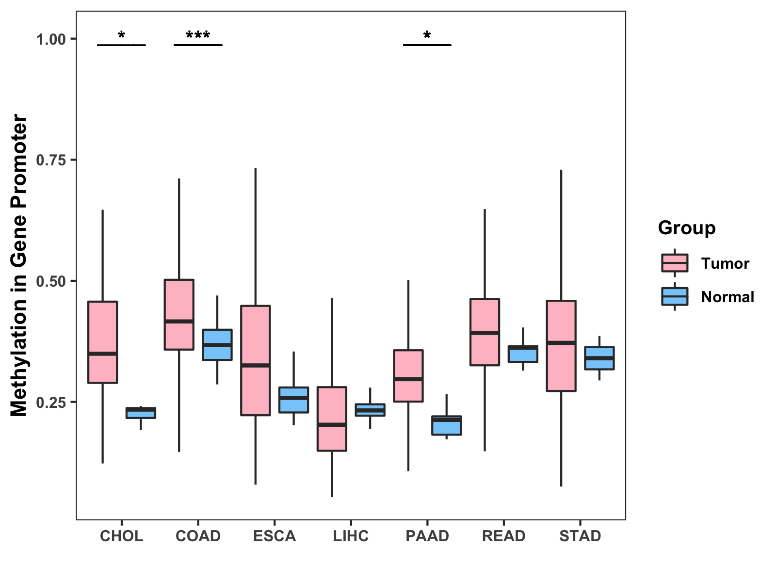 Boxplot of All Gastrointestinal Cancer ( * : 0.01-0.05 , ** : 0.005-0.01 , *** : 0.0001-0.005 , **** : < 0.0001 ) |