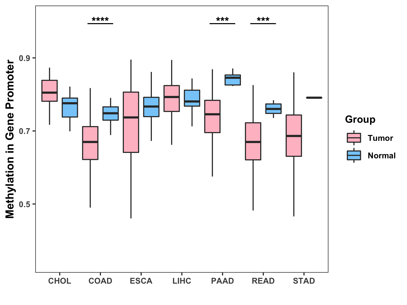 Boxplot of All Gastrointestinal Cancer ( * : 0.01-0.05 , ** : 0.005-0.01 , *** : 0.0001-0.005 , **** : < 0.0001 ) |