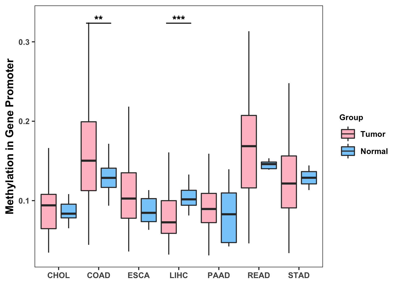 Boxplot of All Gastrointestinal Cancer ( * : 0.01-0.05 , ** : 0.005-0.01 , *** : 0.0001-0.005 , **** : < 0.0001 ) |