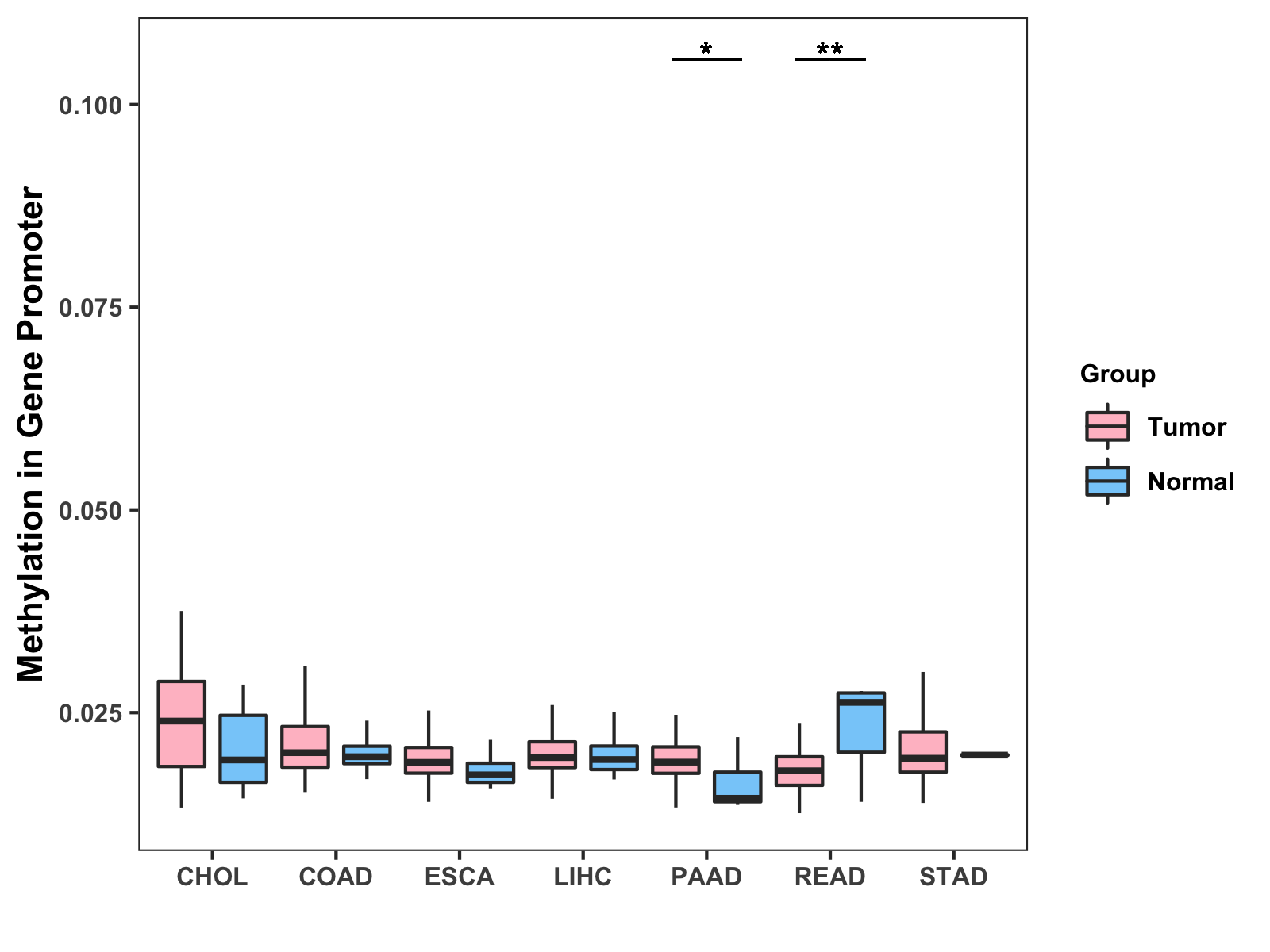 Boxplot of All Gastrointestinal Cancer ( * : 0.01-0.05 , ** : 0.005-0.01 , *** : 0.0001-0.005 , **** : < 0.0001 ) |