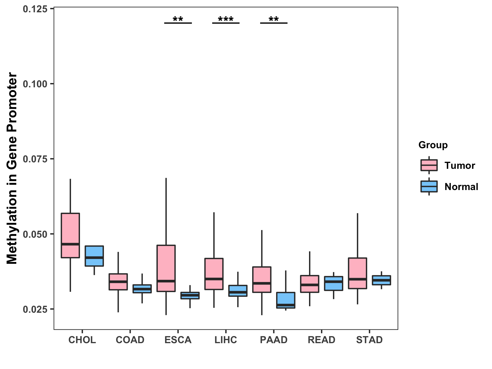 Boxplot of All Gastrointestinal Cancer ( * : 0.01-0.05 , ** : 0.005-0.01 , *** : 0.0001-0.005 , **** : < 0.0001 ) |