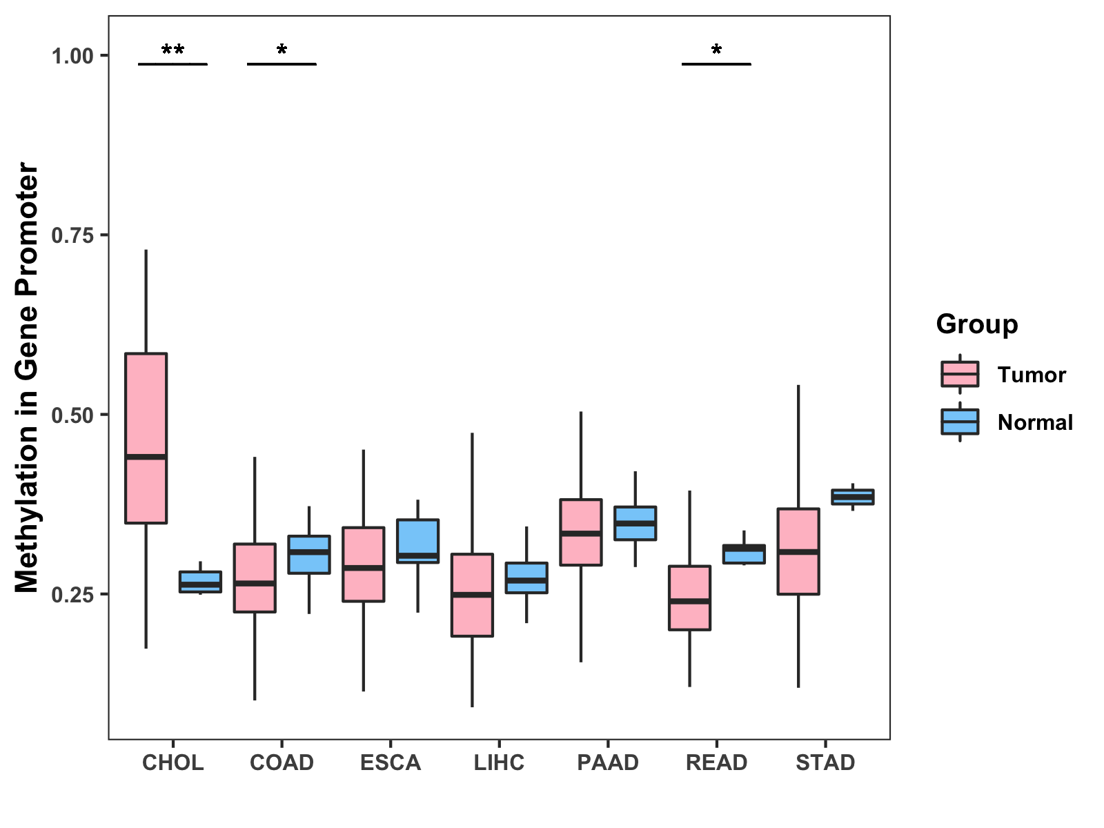 Boxplot of All Gastrointestinal Cancer ( * : 0.01-0.05 , ** : 0.005-0.01 , *** : 0.0001-0.005 , **** : < 0.0001 ) |