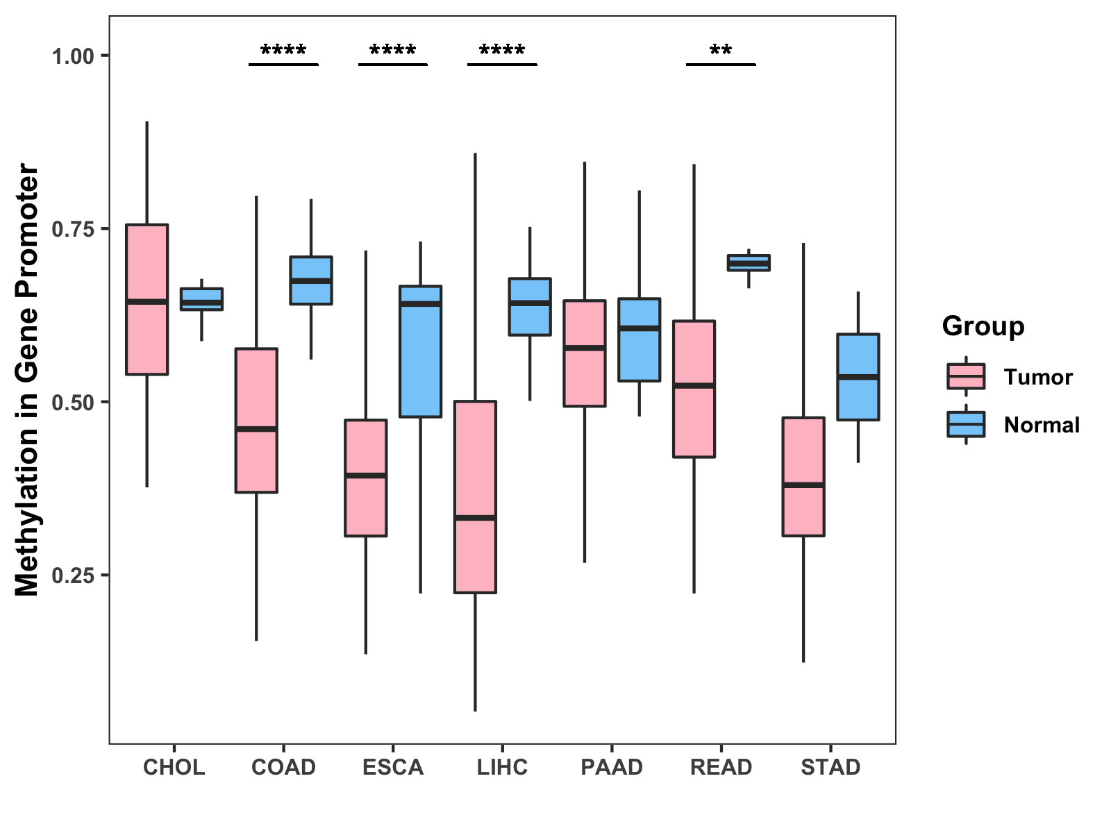 Boxplot of All Gastrointestinal Cancer ( * : 0.01-0.05 , ** : 0.005-0.01 , *** : 0.0001-0.005 , **** : < 0.0001 ) |