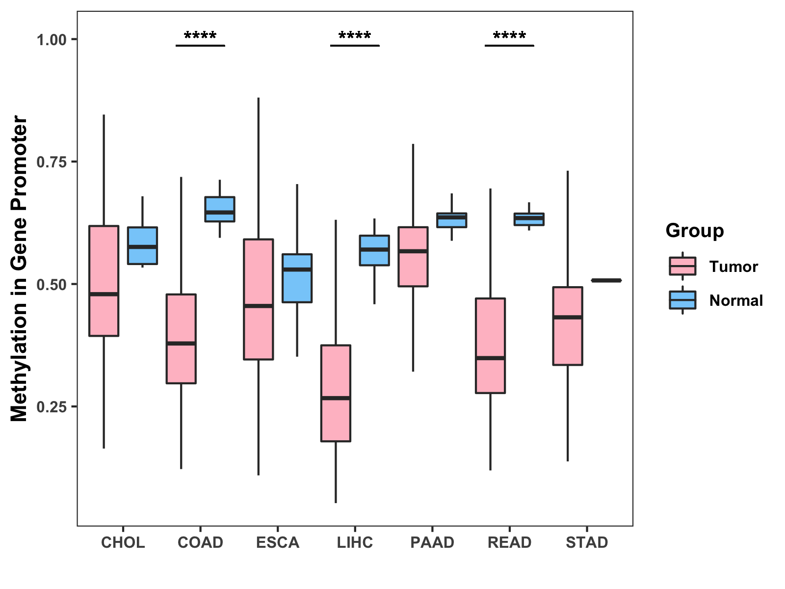 Boxplot of All Gastrointestinal Cancer ( * : 0.01-0.05 , ** : 0.005-0.01 , *** : 0.0001-0.005 , **** : < 0.0001 ) |