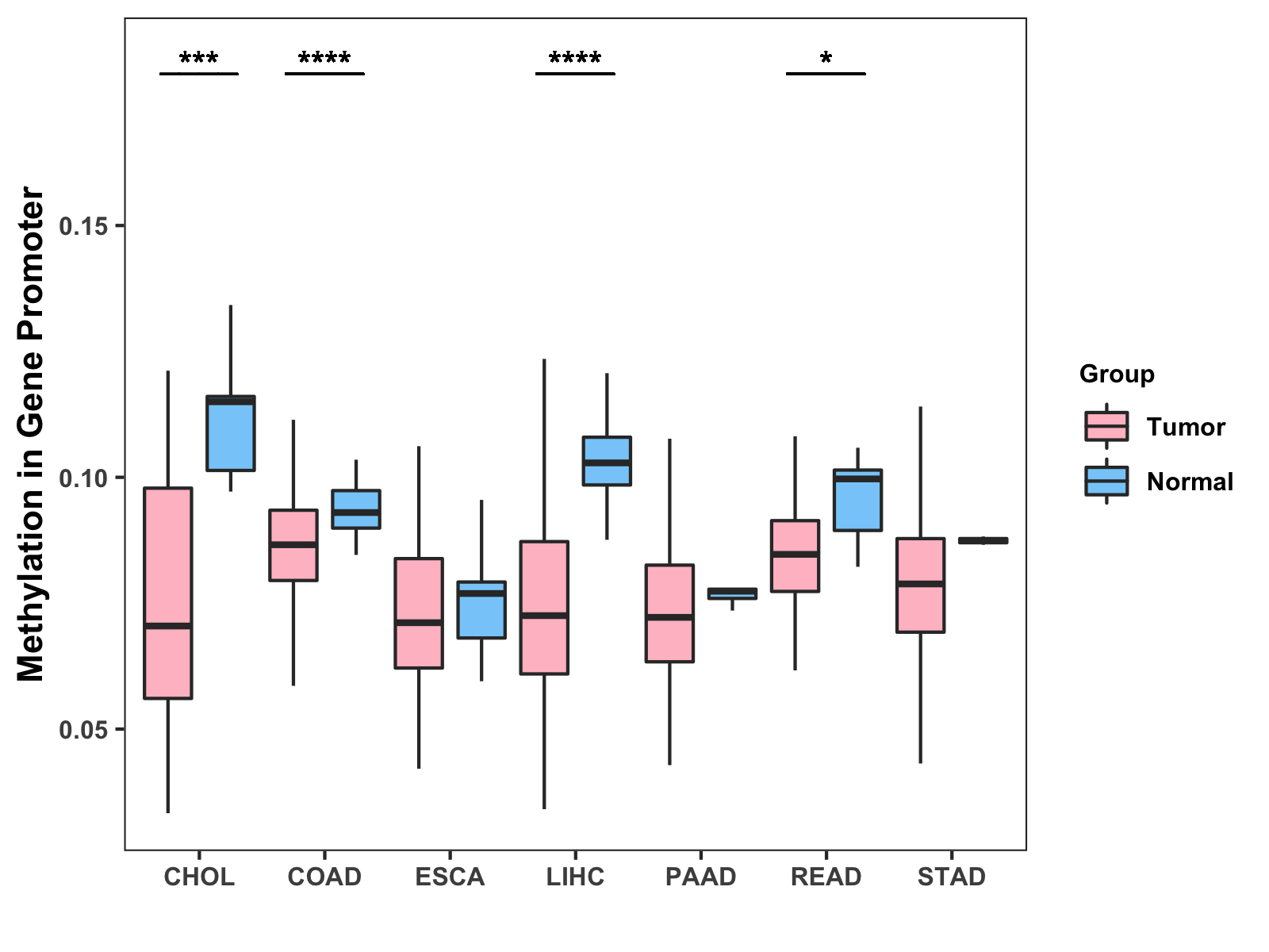 Boxplot of All Gastrointestinal Cancer ( * : 0.01-0.05 , ** : 0.005-0.01 , *** : 0.0001-0.005 , **** : < 0.0001 ) |