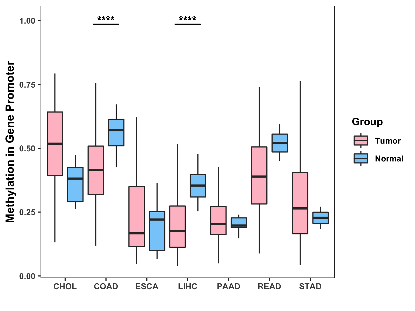 Boxplot of All Gastrointestinal Cancer ( * : 0.01-0.05 , ** : 0.005-0.01 , *** : 0.0001-0.005 , **** : < 0.0001 ) |