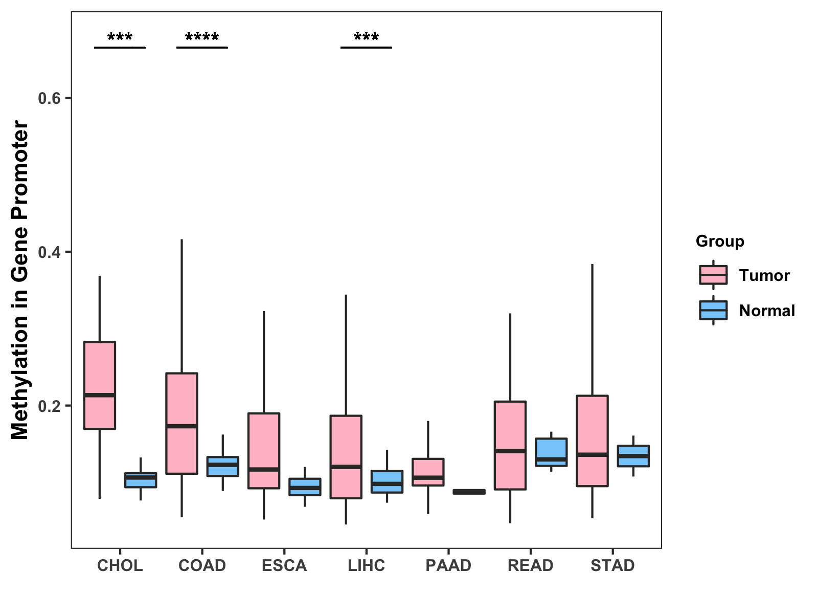 Boxplot of All Gastrointestinal Cancer ( * : 0.01-0.05 , ** : 0.005-0.01 , *** : 0.0001-0.005 , **** : < 0.0001 ) |