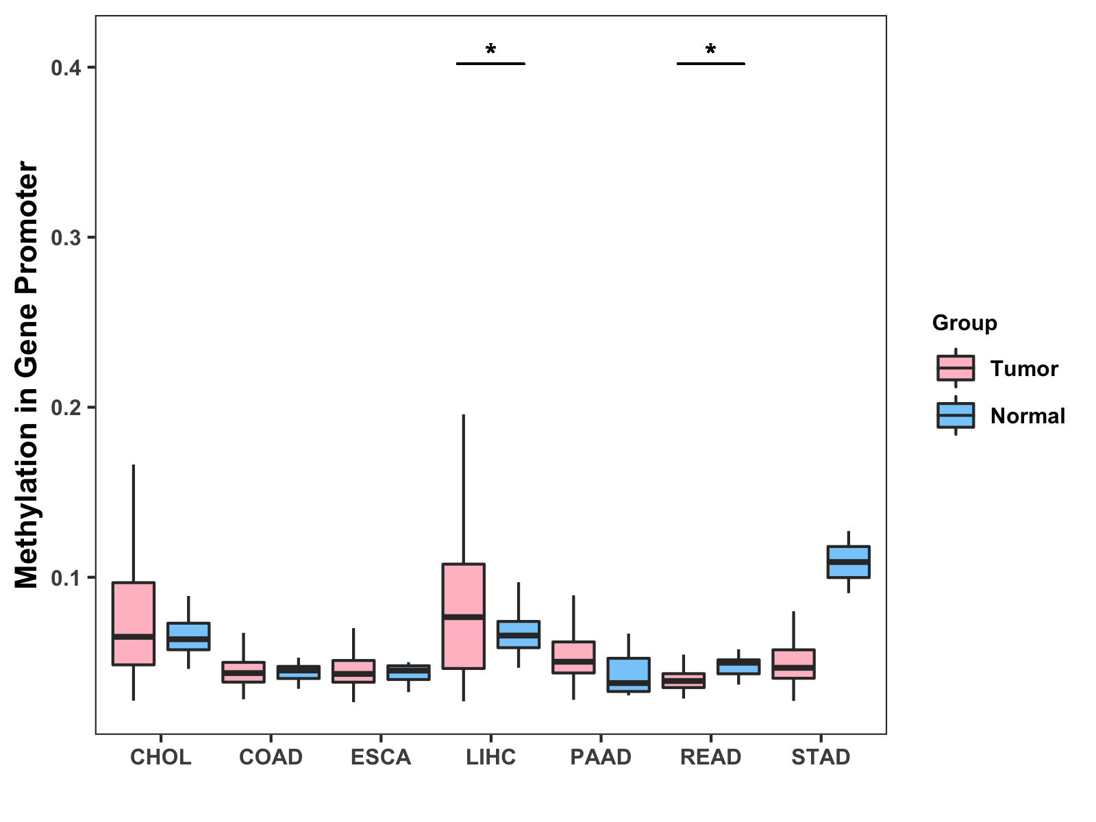 Boxplot of All Gastrointestinal Cancer ( * : 0.01-0.05 , ** : 0.005-0.01 , *** : 0.0001-0.005 , **** : < 0.0001 ) |
